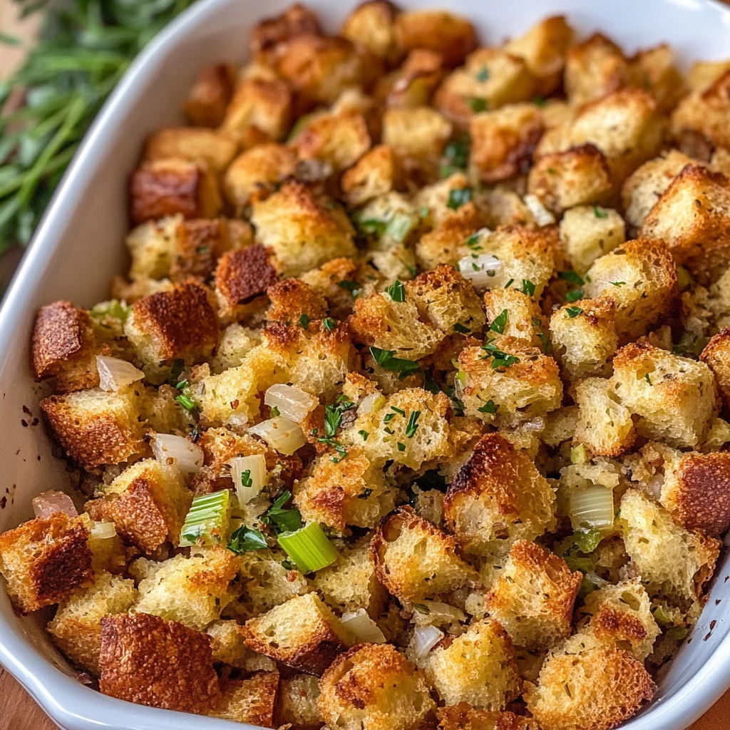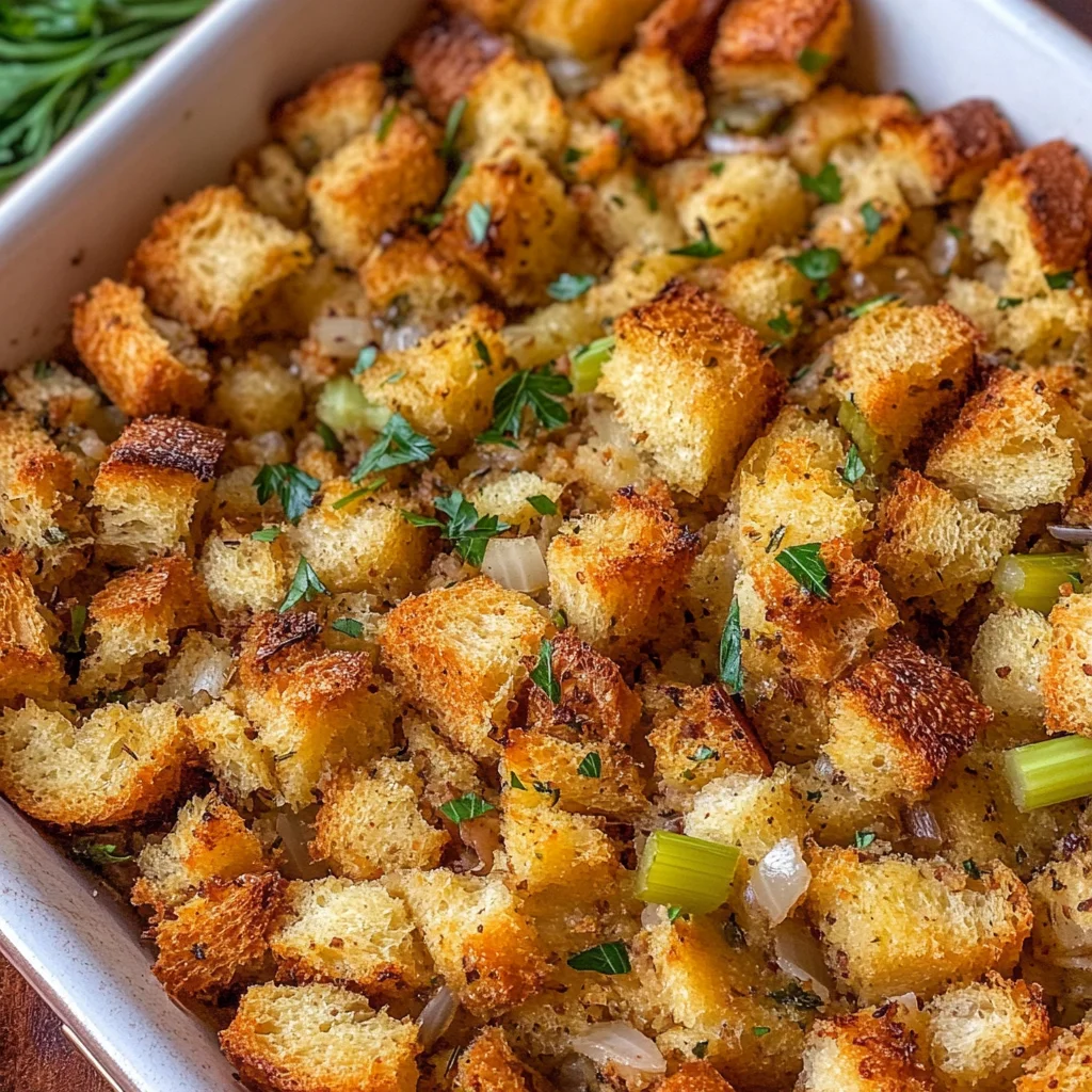 What makes this recipe truly special is its perfect balance of flavors and textures—chewy bread, savory herbs, and just the right amount of moisture. Whether you’re serving it at a grand feast or enjoying it on a cozy weeknight, this stuffing is bound to be a favorite at your table.